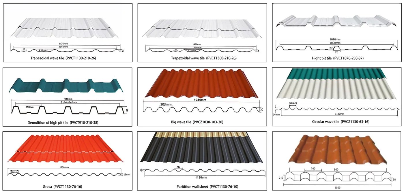 - 1. PVCT1130-210-26. It is exactly alike the steel roofing profile, and take the place of steel roofing. The most popular profile for most country.
